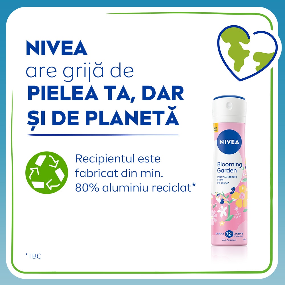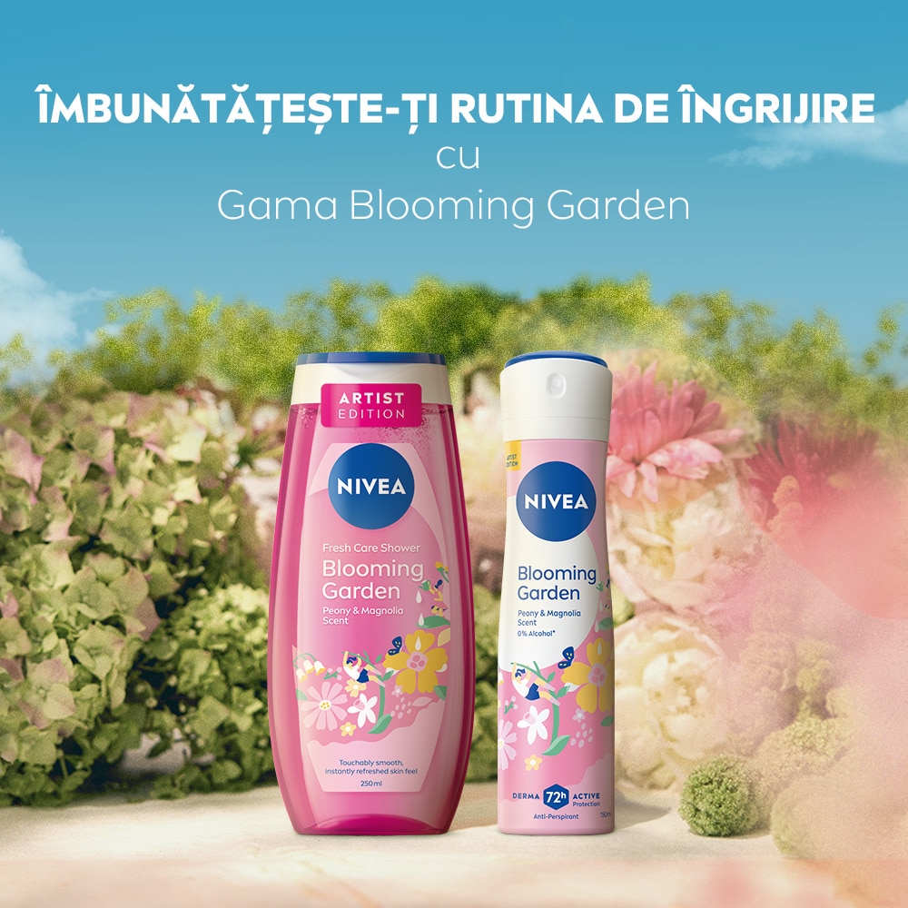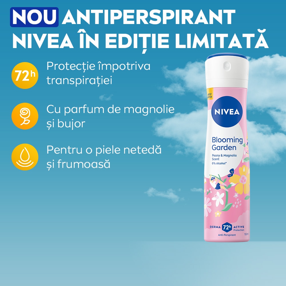 Antiperspirantul NIVEA Blooming Garden ofera protectie timp de 72 de ore avand un parfum floral de bujor si magnolie. Nu contine alcool si este testat dermatologic.